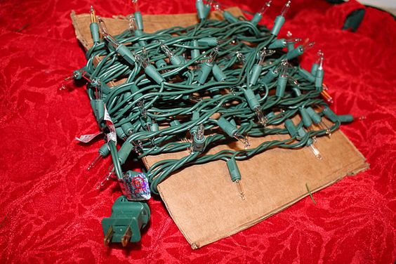 Ahora si te preguntas ¿cómo gurdar las luces navideñas? y además no eres de esas personas que tienen mas paciencia que el mes de mayo, entonces te proponemos utilizar un trozo de carton, madera o cualquier otro material resistente y envolver en él las luces de navidad, tal y como puedes observar en estas imagenes.