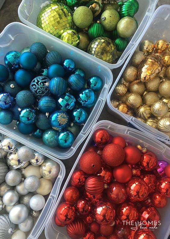 Las cajas de plástico o cartón también son ideales para guardar las esferas navideñas, puesto que las protegen y las mantienen limpias. Hay distintas opciones de las que puedes echar mano al momento de almacenarlas; la primera es organizar las esferas por color, es decir utilizar una caja para guardar todas las esferas de un mismo color, o separlas de igual manera en bolsas para luego meterlas dentro de la caja.