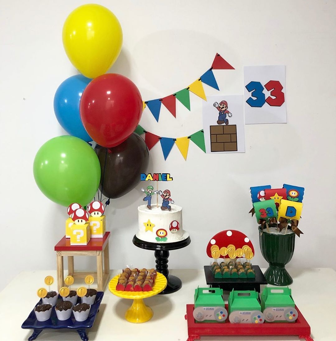 El tema de los videojuegos son un clásico para los niños, por eso una fiesta de Mario Bros es perfecta, ya que incluye colores alegres. Algunas decoraciones para esta temática son banderines y globos amarillos, azules, rojos y verdes, agrega un plus con hojas impresas a color referentes a este personaje.