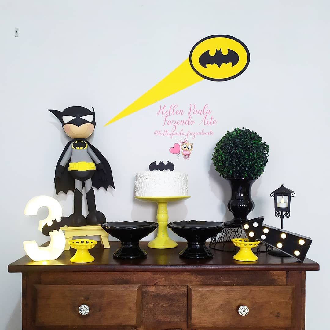Encuentra un lugar de la casa que funcione como escenario, puede ser un espacio con una mesa, una bufetera, o consoleta y coloca sobre ella detalles de Batman, como juguetes y peluches. Como algo adicional puedes elaborar la batiseñal y pegarla a la pared, utilizando papel amarillo y negro.