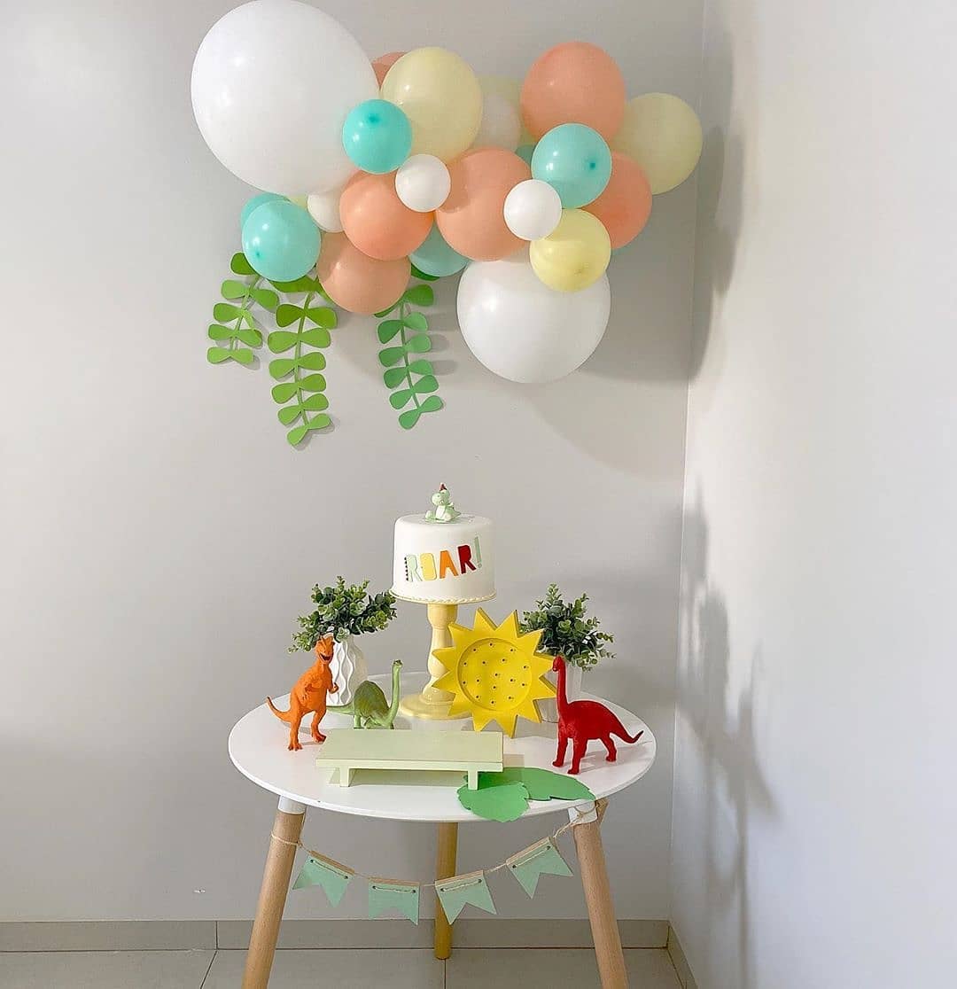 Las fiestas de dinosaurios son de las preferidas por los niños pequeños, para lograr una decoracion sencilla de esta tematica, te recomiendo un adorno con globos en la pared y como extra poner ramas y naturaleza hechas con papel. No olvides poner en la mesa figuras o juguetes de dinosaurios.