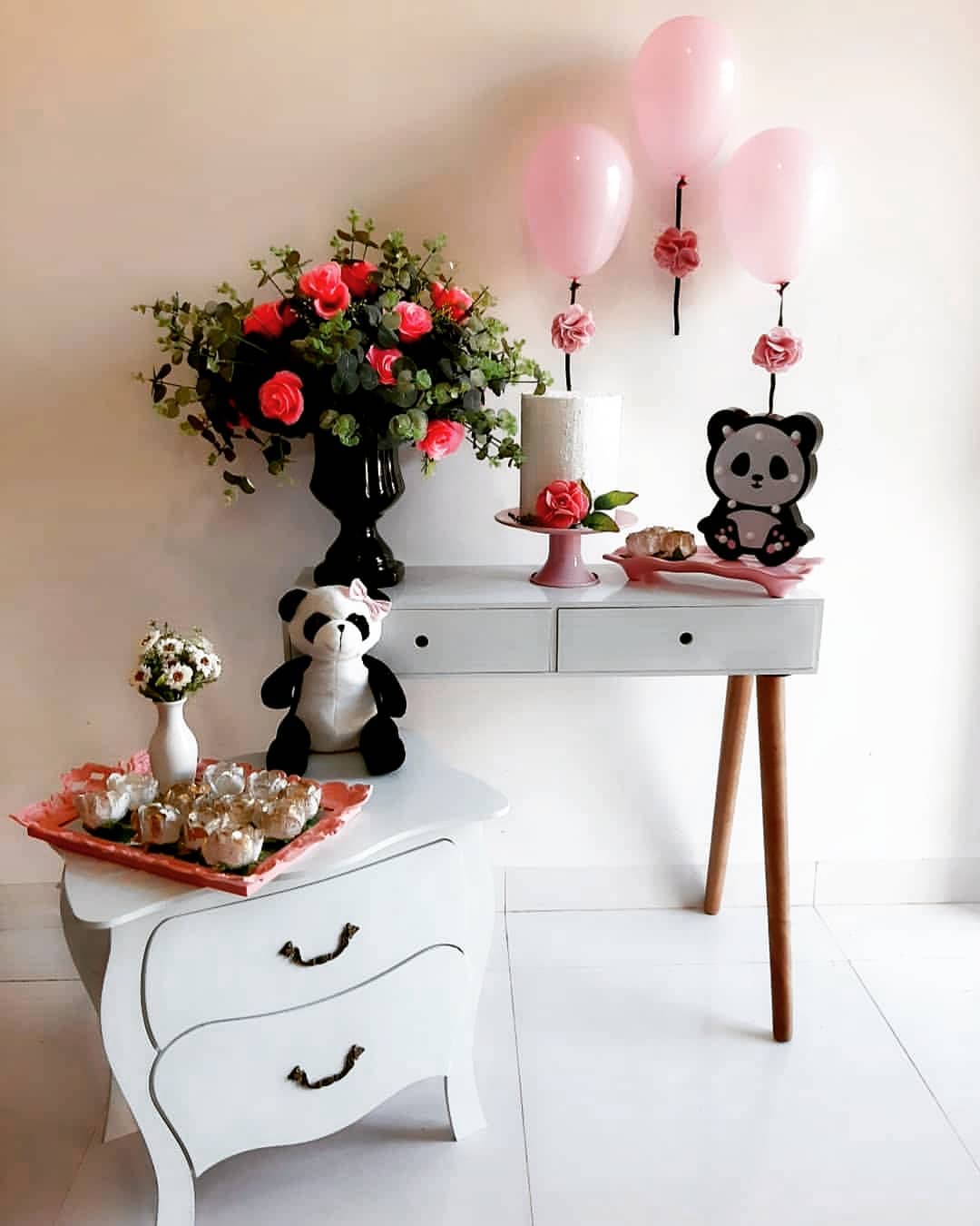 Y si, las fiestas de oso panda son modernas y son ideales para niñas de cualquier edad; utilizar un florero, globos y un detalle con forma de este personaje es mas que suficiente para decorar esta celebración en casa.