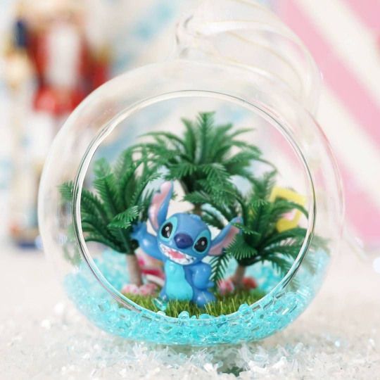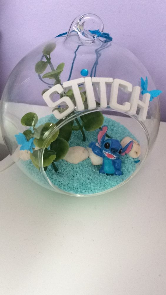 Colocar juguetes y plantas artificiales en miniatura es solo una alternativa para crear Centros de mesa de Stitch.