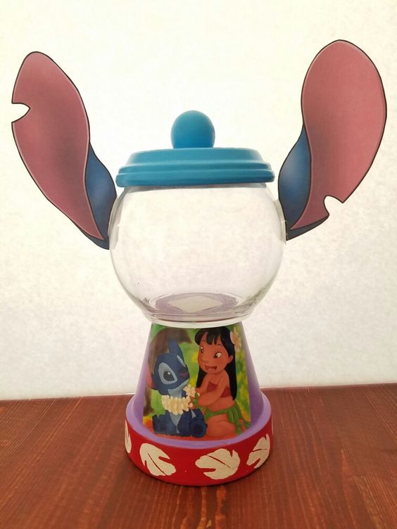 Algo menos complicado, pero no menos lindo, sería pintar una maceta como Stitch, y colocar en ella dulces o plantitas, de esta manera, se puede decir que el centro de mesa será reutilizable o tendrá un segundo uso en casa.