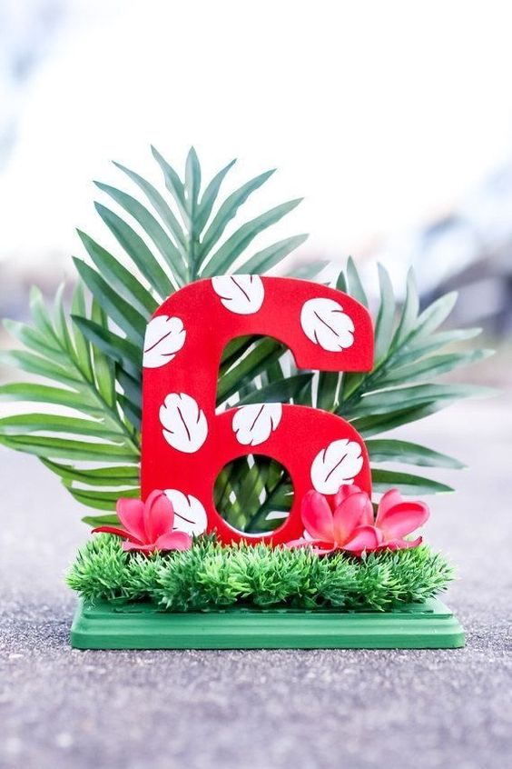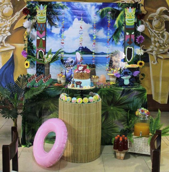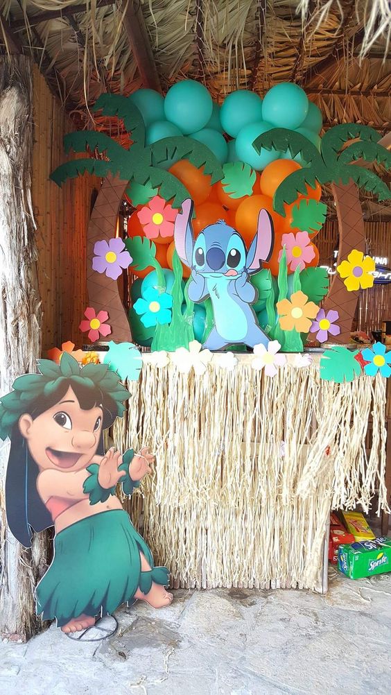 Las imagenes gigantes de Lilo y Stitch, asi como flores y palmeras hechas con carton, cloroplas o hielo seco son solo unas de las manualidades que puedes hacer para decorar la fiesta de Stitch.