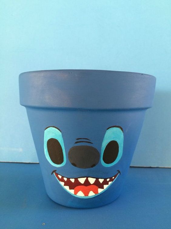 No podemos dejar fuera las macetas, ya que con ellas podemos hacer diferentes tipos de objetos; uno de ellos son los dulceros, donde las macetas funcionan como base y crean centros de mesa de Stitch sencillos.