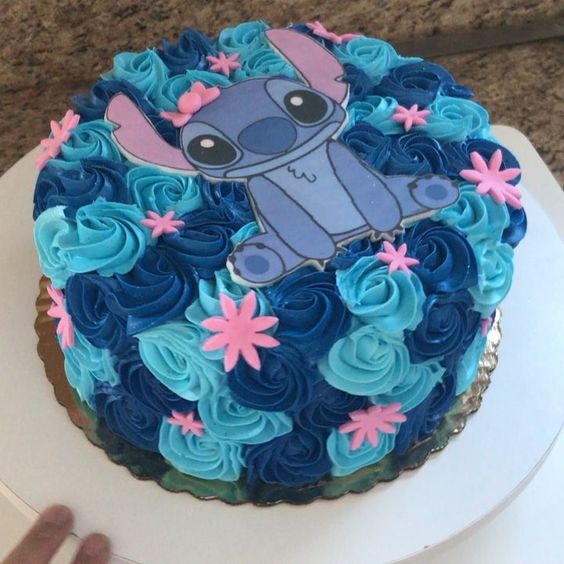 De igual forma, el betún es uno de los ingredientes tradicionales para hacer pasteles. Un diseño que queda muy acorde a la tematica de Stitch, son las flores, en especial usando tonos azulados.